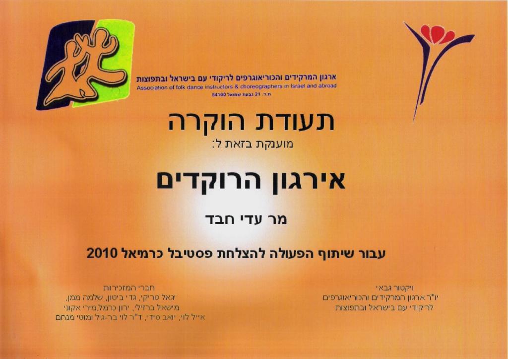 | תעודת הוקרה לארגון הרוקדים בפסטיבל כרמיאל | ארגון הרוקדים | 29.7.10 | |